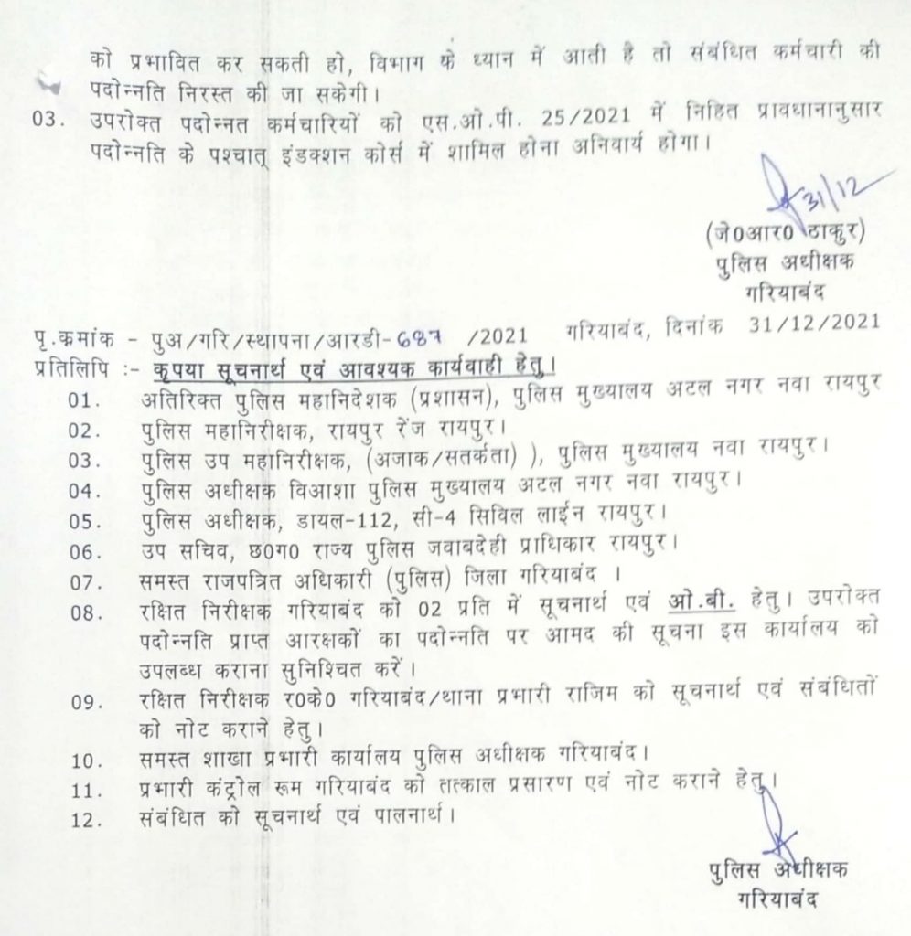 उपरोक्त पदोन्नत आरक्षकों की नविन नियुक्ति आदेश पृथक से जारी किया जाएगा।