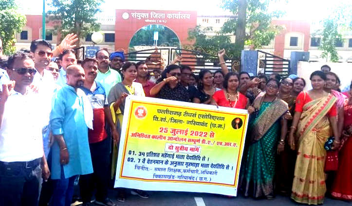 गरियाबंद : गरियाबंद में आज टीचर्स एसोसिएशन के बैनर तले सैकड़ों टीचर्स ने जिला स्तरीय रैली निकालकर जिला कलेक्ट्रेट के बाहर जमकर प्रदर्शन किया इन्होंने अपनी मांगों के संबंध में बताया कि छत्तीसगढ़ शासन द्वारा 34 प्रतिशत मंहगाई भत्ता के स्थान पर राज्य के कर्मचारियों, अधिकारियों व शिक्षकों को केवल 22 प्रतिशत महंगाई भत्ता देय है। साथ ही पेंशनरों को केवल 17 प्रतिशत मंहगाई भत्ता मिल रहा है, जबकि केंद्र सरकार व अन्य राज्य सरकारों द्वारा कर्मचारियों, अधिकारियों, शिक्षकों व पेंशनरों को 34 प्रतिशत मंहगाई भत्ता दिया जा रहा है।