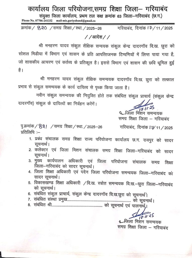 गरियाबंद : सोशल मीडिया पर प्रशासन विरोधी टिप्पणी करना पड़ा महंगा, चार संकुल समन्वयकों को पद से हटाया